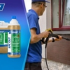 - Užpurkškite produktą ant valomo paviršiaus purkštuku ir paskui plaukite jį dideliu spaudimu