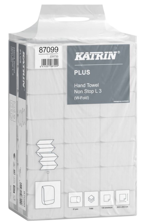 Rankšluostinės servetėlės „Katrin Plus W-fold Paper Towels Non-Stop Long 90 Sheets 3-Ply, Handy Pack” (kodas 87099)