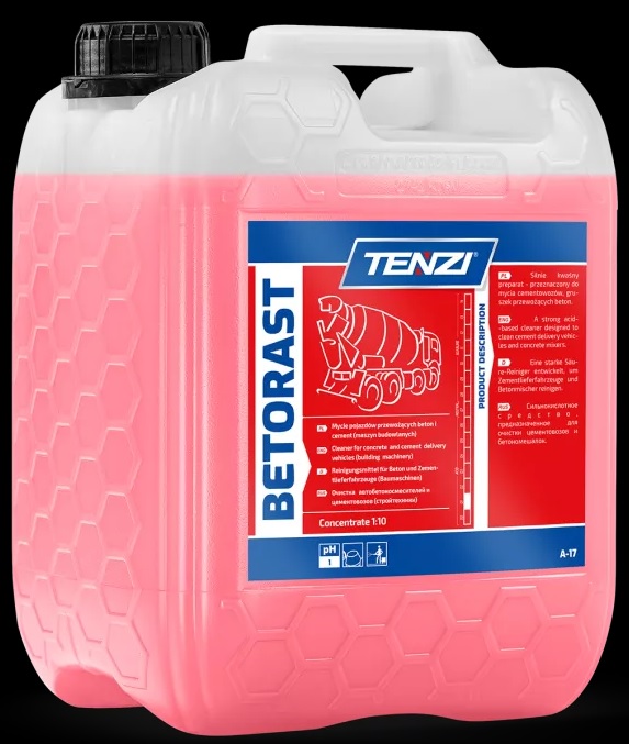 Efektyvus rūgštims atsparus valiklis betono maišyklėms ir statybinei įrangai. Greitai ir be korozijos ištirpdo rūdis, betono ir cemento nuosėdas. Netinka emaliuotiems paviršiams. Prieš naudojimą praskieskite.